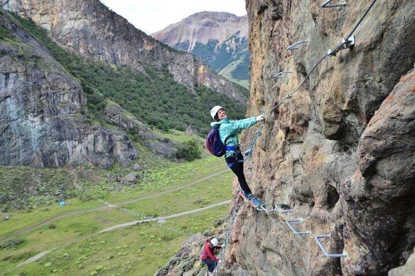 It is a safest way to climb, that combines climbing, hiking, and scrambling, and doesn’t require any climbing experience. The rock is equipped with a steel cable anchored which runs up the entire route. Placing ladder rungs, steel steps, suspension bridges strategically along the iron path, to allow climbers to move trough challenging terrain. With an epic ending zip line, leading the group to the higher part of the mountain, to enjoy the fantastic vistas of the valley, mountains, glaciers and Fitz Roy range. This Via Ferrata special construction allows you to slide a locked carabiner on your harness over each permanent anchor point without ever having to detach it from the cable, making a safe, secure and fun experience! Meeting with the guide, briefing, aproach to the base (1 mile flat), via ferrata, descent to the estancia entrance. The Via Ferrata runs 1800 ft, and the elevation gain is 600 ft. Each participant will be provided with helmet, harness, and specialised lanyard. This assisted climbing experience doesn’t require any specialised climbing skills, although is important to have general physical fitness to hike continuously, and a big sense of adventure!.