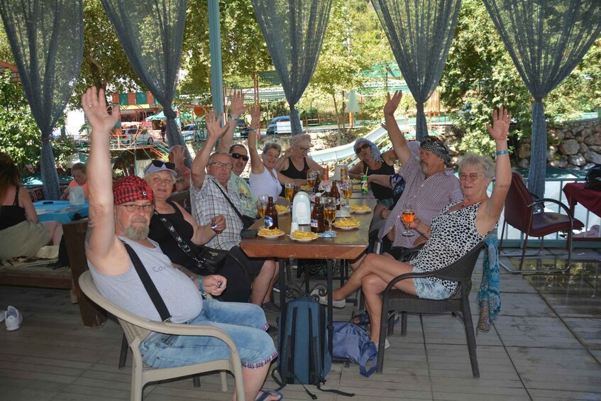 After another water fight break, the tour continues to a traditional Turkish village, where you'll have 30 minutes to taste fresh seasonal fruits and browse the local market for unique souvenirs. The adventure proceeds with a 45-minute exploration of a natural cave, allowing you to admire its cool and captivating interior. Finally, relax at the tranquil Dim River for 1.5 hours, where you can swim or simply unwind by the riverside.