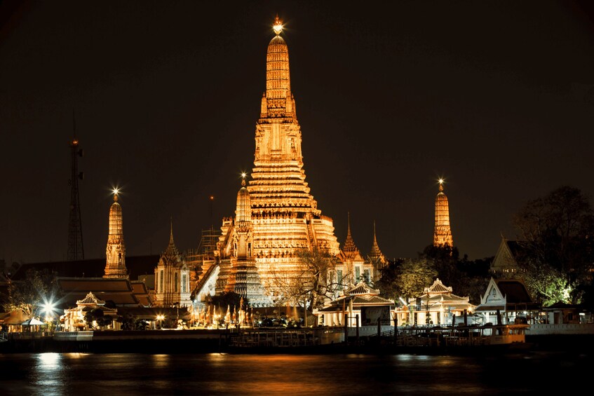 As night falls, admire two of Thailand’s most famous landmarks — the Grand Palace and Wat Arun — beautifully illuminated against the dark sky. Viewed from the exterior, these historic sites shine even more dramatically after sunset and provide unforgettable photo opportunities.