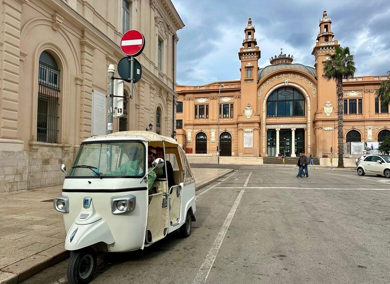 Discover Bari from an exclusive perspective aboard the timeless Ape Calessino, a symbol of Italian style and la dolce vita. The panoramic tour lasts one hour and is designed for a maximum of two people, ideal for couples looking for a special moment or friends who want to experience the city in an original way, letting themselves be carried slowly through its most evocative views. The meeting point is in the heart of the historic centre, where you will meet the driver who will accompany you throughout the tour. From there, you will reach Pane e Pomodoro beach, a symbol of summer life in Bari. The tour continues along the monumental seafront, passing palm trees, historic buildings, and sweeping views of the sea. Along the way, you will pass the fish market, a lively and authentic area, and then in front of the Margherita Theatre, built on the water, and the famous Petruzzelli Theatre. The tour will also take you to the port area decorated with colourful street art, until you reach the Fiera del Levante area, a symbol of modern and commercial Bari. The final stop will be the San Cataldo Lighthouse, where you will also find the small but fascinating Radio Museum. Let yourself be carried away by the slow pace of the Ape Calessino and the timeless charm of Bari.