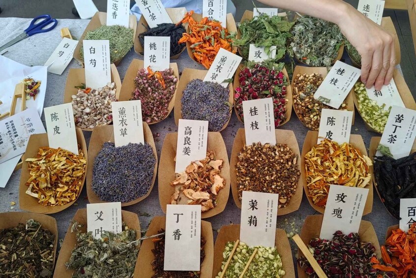 Next, meet the herbs. Smell and learn about a selection of 6-8 natural Chinese herbs (e.g., Lavender, Chrysanthemum, Clove, Mugwort) and their uses. Using a small scale, mix your chosen herbs to create a signature scent that suits your needs.