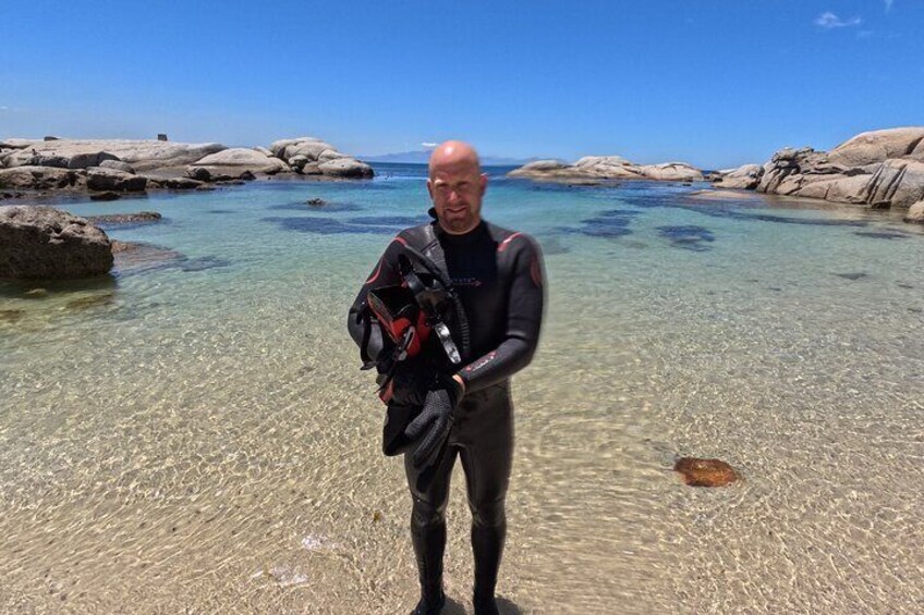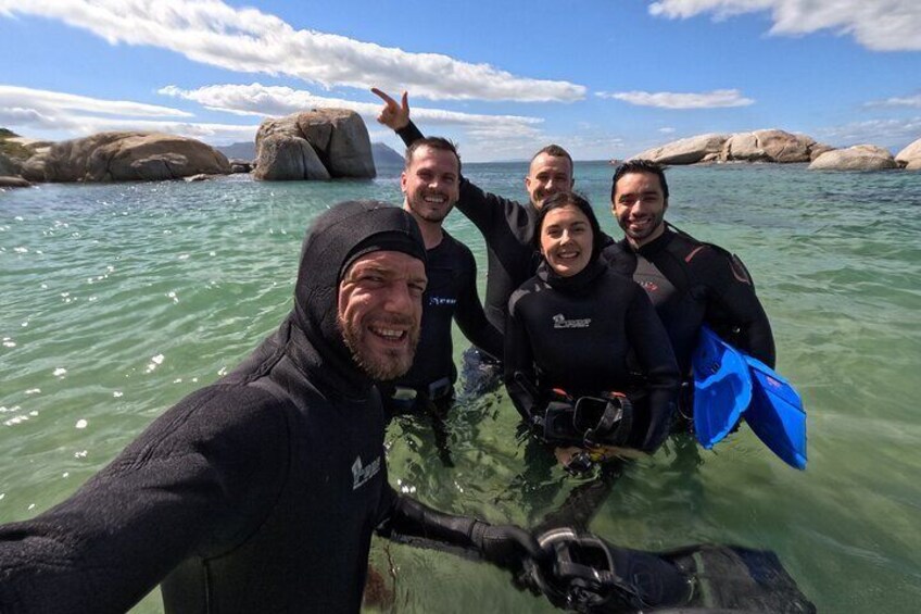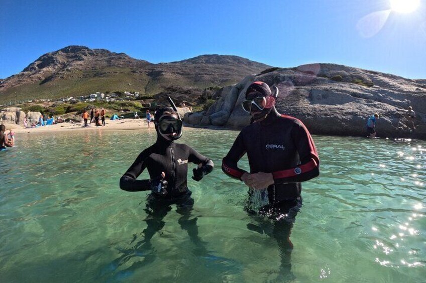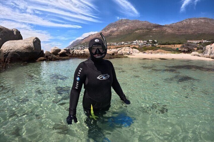 Your journey begins at Jubilee Square, where we’ll meet before heading to a private fitting area to ensure you have the perfect high-quality snorkelling gear for maximum comfort during your experience. Next, we’ll make our way to an exclusive, secluded beach – a hidden gem far from the crowds – where you’ll receive a personalised safety briefing. Unlike boat-based snorkelling, our beach entry provides a smooth, comfortable way to immerse yourself in the wonders of the False Bay without worrying about seasickness. Once in the water, we’ll glide through the breathtaking kelp forest, a hidden underwater paradise teeming with marine life. We will encounter vibrant sea creatures, swaying golden kelp, and the magic of the Cape’s unique underwater world. After our snorkelling adventure, we’ll dry off and take a relaxed walk along the coast to spot some penguins lounging between the boulders — the perfect way to end the day!