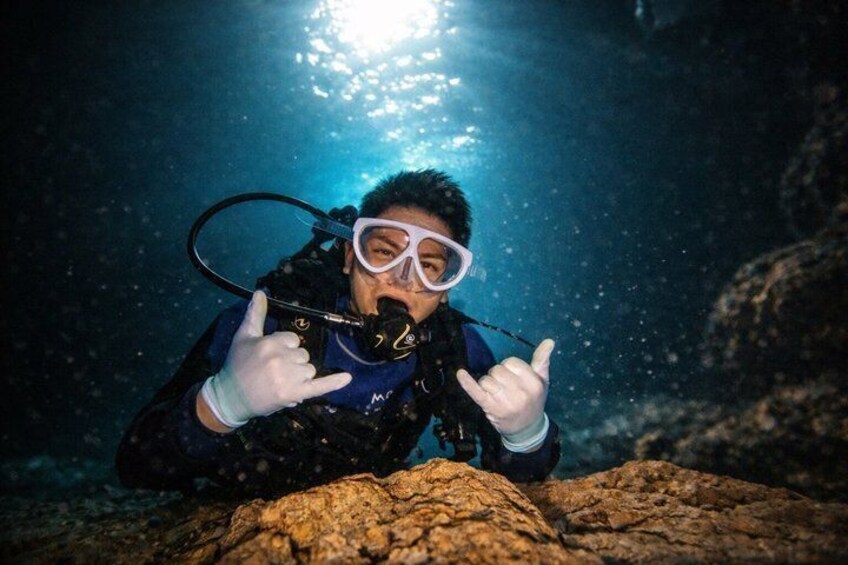 Boat entry diving at the Blue Cave in Onna Village, Okinawa!
