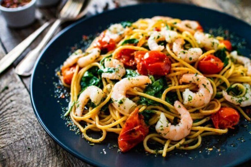 A Mediterranean Feast: Fresh salads, tzatziki, savoury starters, pasta with shrimps and seasonal fruits — paired with wine, raki, or a soft drink.