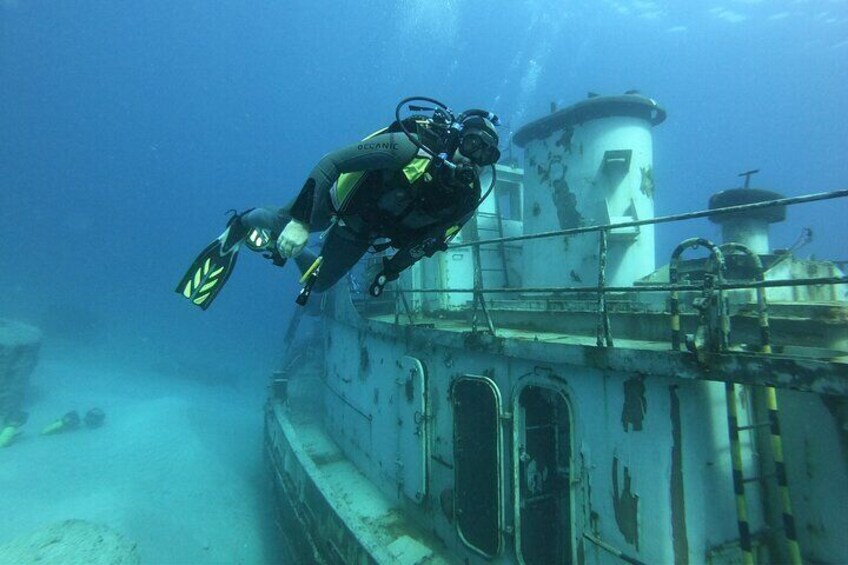You will see of the most sought-after diving spots in Chania that you must include in your dive programme. The programmes are aimed at active certified divers and include 2 boat dives, which depend on the weather conditions on the specific days. The Elephant Cave programme (2 boat dives), which is a must for any diver visiting Crete, is very easy, with 2 huge chambers, very shallow water (2 & 1 metre respectively), breathable air, at a maximum depth of 12 metres, and visibility of more than 20 metres and the most beautiful crystal clear water. Inside you will be able to see 60000 years old fossils of elephants and deers. See the first diving park of Greece, where you’ll explore 44 thriving artificial reefs and the fascinating wreck of "Nestor", a vibrant hub for marine life. The Tugboat Nestore Wreck, which lies about 20 metres deep, was sunk on April 10, 2025. During your dives, we will explore Apokoronas Diving Park with a thrilling 2 shore dives using sea scooters to reach 44 artificial reefs and the sunken Tugboat R/K Nestor—an exciting new underwater site designed to support marine life and amaze divers.