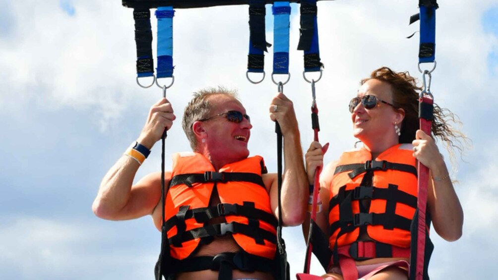 When boarding the boat you will be provided with the necessary safety equipment and instructions. Once ready you will be hooked to the parasail. When everything is ready the boat will start to move faster and you and your companion will start to rise safely.