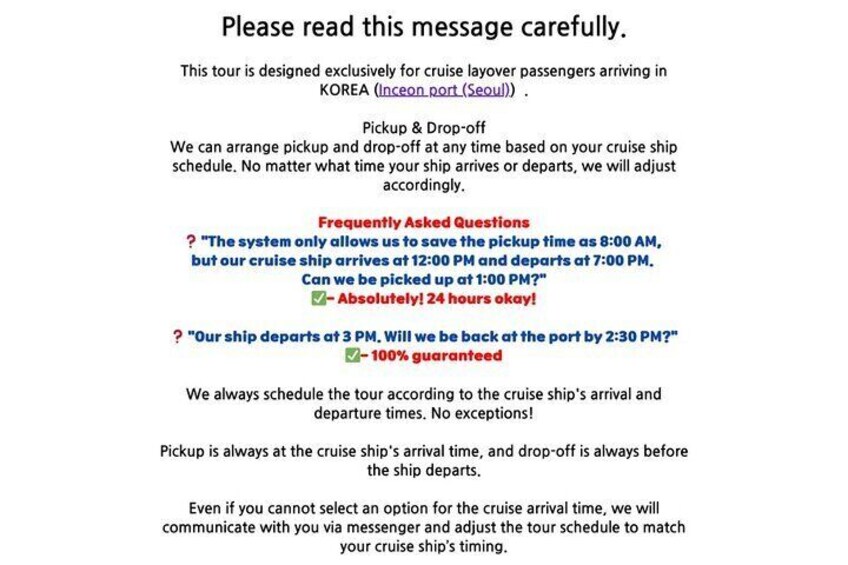 Cruise Guests Stopover Incheon Port Seoul Private Car Tour