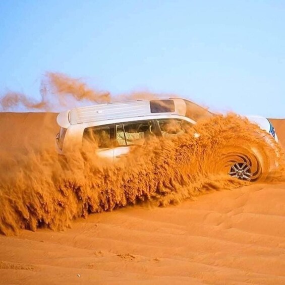Shared desert safari with 30-minute quad biking in a designated area, dune bashing, sandboarding, and Inland Sea visit. Shared 4x4 vehicle (max 6 guests). No camel ride. Pick-up from the National Museum metro station exit 2.
