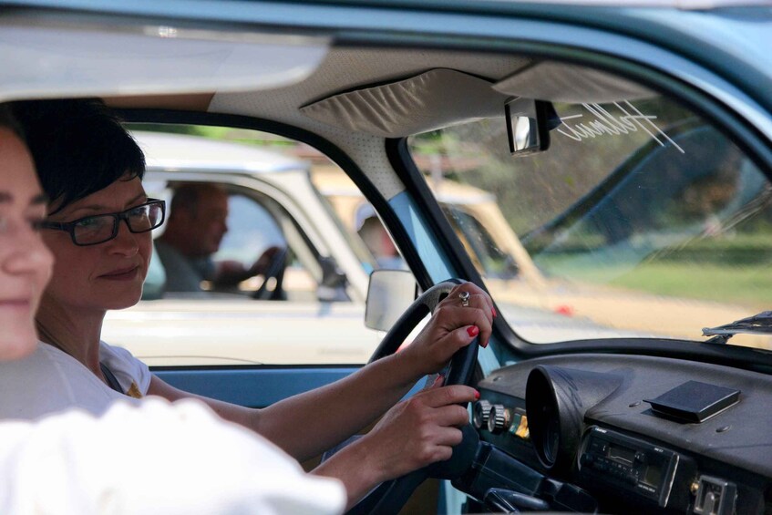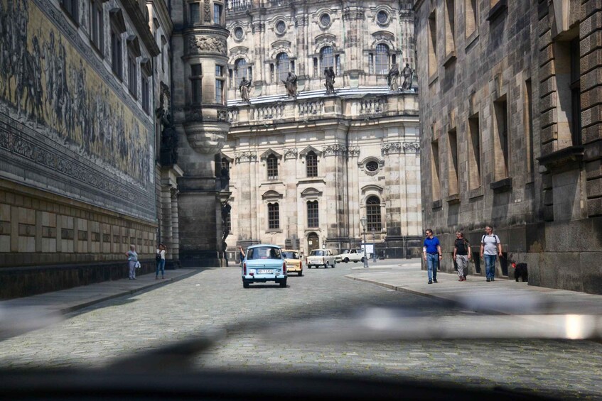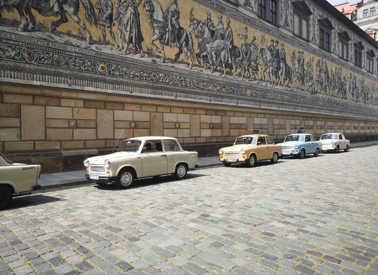 Our big Trabant tour through Dresden starts at the listed Simmel Centre (Turnerweg / Antonstraße 2A, 01097 Dresden) and heads towards the exhibition grounds and the old slaughterhouse. Past the former Yenidze cigarette factory, the Congress Centre, and Erlweinspeicher, the convoy rumbles through Dresden's old town to Theaterplatz, where you'll discover historic buildings such as the Taschenbergpalais, the Semperoper, and the Residenzschloss.