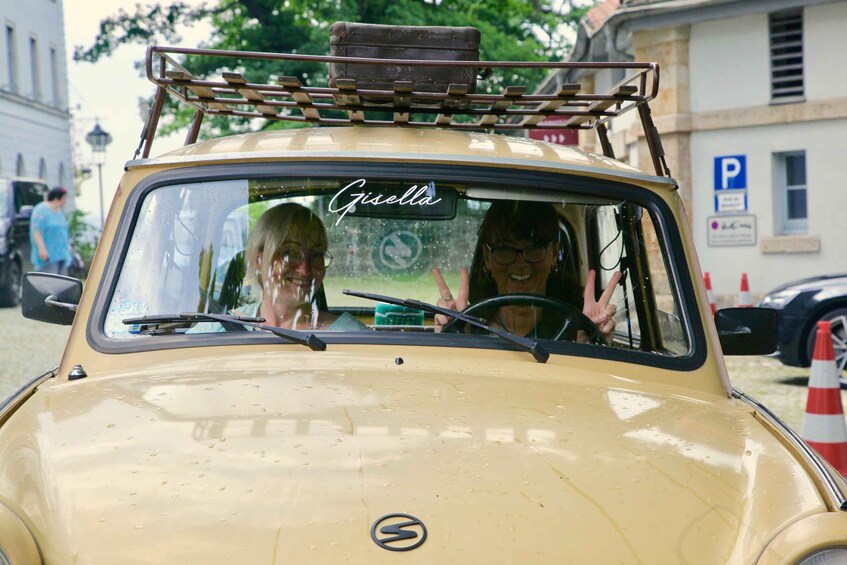 On the terrace bank, you'll cross the Augustus Bridge, the Brühl Terrace, and the historic Procession of Princes. Passing the Kurländer Palais and the “Golden Town Hall Man,” you'll encounter the Great Garden and the glass VW factory along the way. The Trabant tour leads over the Albert Bridge through the Inner and Outer New Town into the Prussian Quarter. Here you'll make your first stop at Lingnerschloss – including a panorama of the Elbe Valley.