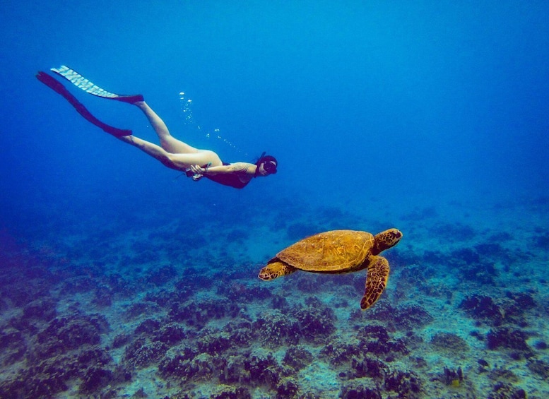 After an introduction and training on how to use the equipment, we will visit the coral reef off the coast of Rapa Nui, swimming with endemic species of the island, surrounded by a magical underwater world, privileged with the best visibility on the planet. We will discover the moai submerged among corals, located in the pink sand beach called Ovahe, which we will record in digital photos and videos to share in your social networks.