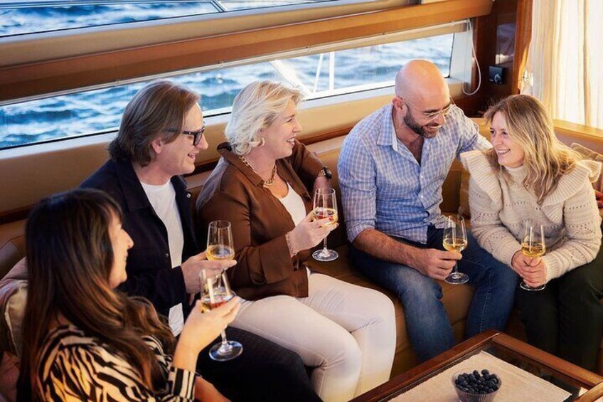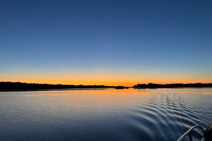 We cruise at slow speed from the city, up the fjord and between islands and beaches, with a nice evening experience either inside the boat, aft deck or from the Panoramic Flybridge on top. Lovely romantic cruise.