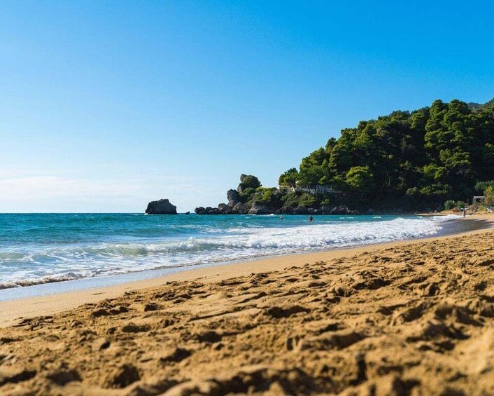 The tour begins with a convenient pickup from the designated meeting point at the Entrance of the Old Fortress in Corfu Town. Travel through the scenic countryside, passing traditional villages, olive groves, and rolling hills before arriving at Glyfada Beach. Upon arrival, step onto the soft golden sands and immerse yourself in the breathtaking coastal scenery. The beach is framed by lush pine and olive trees, providing a picturesque setting for a relaxing seaside experience. Sunbeds and umbrellas are available for rent, allowing you to lounge comfortably by the water. The shallow, crystal-clear sea is perfect for swimming, while the clear visibility makes it an excellent spot for snorkelling. For those looking for adventure, Glyfada Beach offers a range of thrilling watersports. Whether you prefer high-energy activities or a peaceful day soaking in the sun, this beach has something for everyone. If you want to enjoy a meal or refreshment, the beachfront bars and tavernas offer a variety of delicious Greek dishes, fresh seafood, and cocktails with a view of the Ionian Sea. Spend approximately three hours enjoying the beach at your own pace before returning to Corfu Town in a comfortable vehicle.