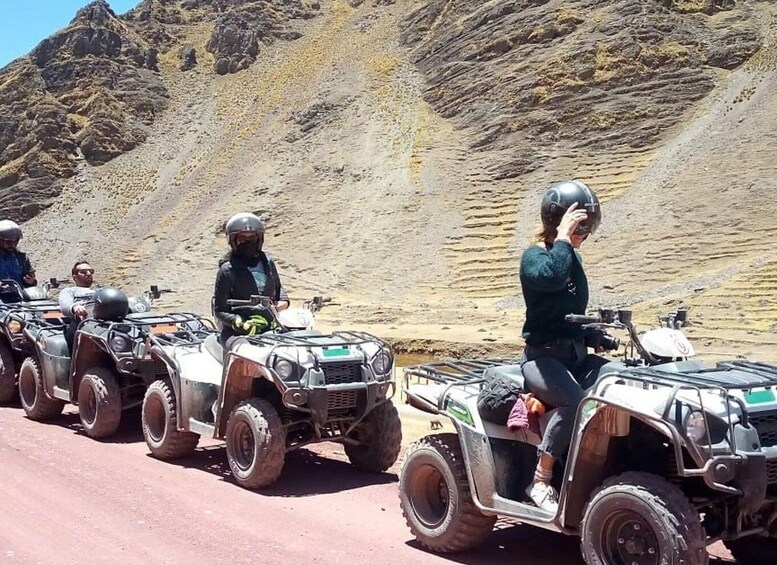 After an hour of quad bike riding, we’ll reach the Red Valley viewpoint, then begin a 30 minute hike to the awe inspiring Rainbow Mountain (Vinicunca). At the summit, enjoy plenty of time to take photos of the vibrant colours of Rainbow Mountain and the majestic Ausangate peak.