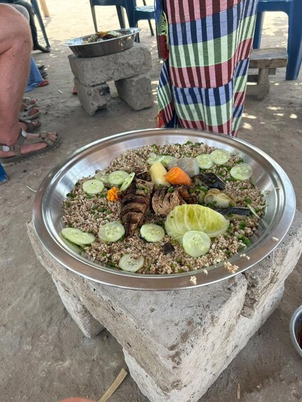 Continue to the village of Sansanding. See gardens, wells, and local homes. Visit an educational community centre full of children, run by the Polish-Gambian organisation One Strive Gambia. Using the products you purchased, lunch will be prepared for you in the village. Cooked over a charcoal fire, this MBAHAL meal will stay in your memories forever.
