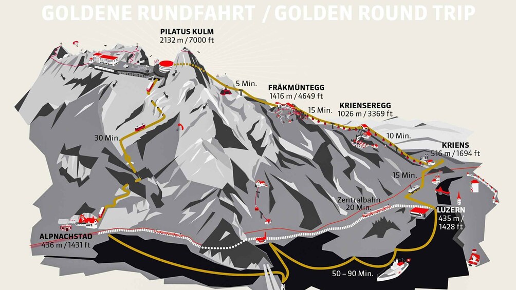 The world's steepest cogwheel railway (built in 1889) will bring you from Pilatus Kulm through fascinating rock faces, sparkling mountain streams and lush meadows carpeted with Alpine flowers down to Alpnachstad. In Alpnachstad you just pass under the street, and you will be at the cruise landing stage in Alpnachstad. After a breathtaking one-hour boat trip on Lake Lucerne, you will arrive in Lucerne, near the station and your unforgettable half-day-trip will finish.
