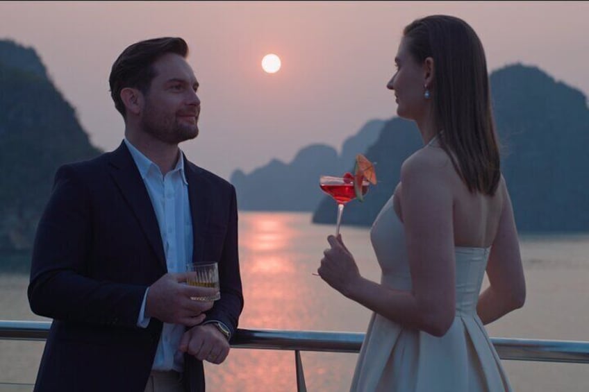 At 17:15, return to the main Calista Cruise and enjoy a relaxing Sunset Party on the sundeck, followed by an engaging cooking workshop. At 19:00, delight in a gourmet dinner at the onboard restaurant. Later, around 21:00, try your hand at squid fishing or simply unwind and enjoy a peaceful night aboard this luxurious 6-Star cruise through Halong Bay.