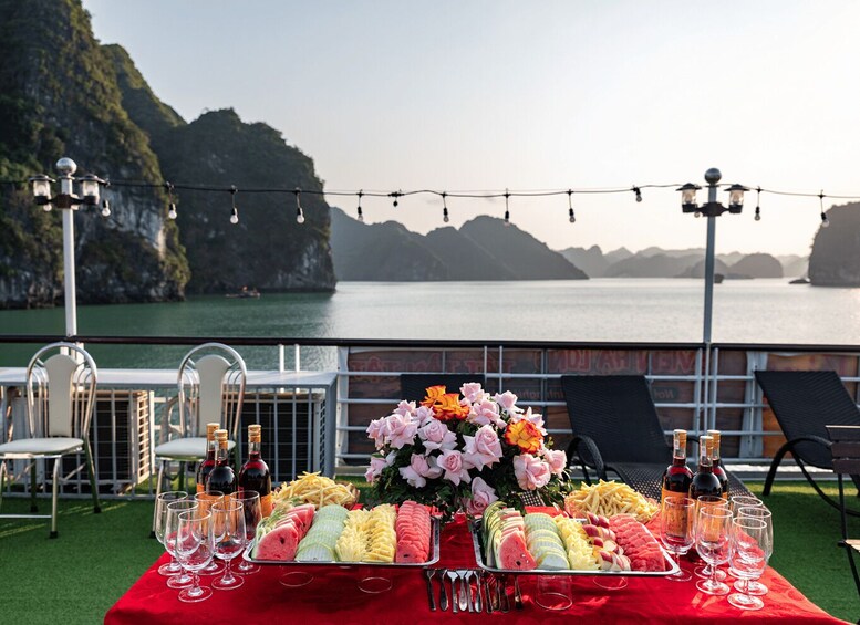 • Sunset party: red wine, light foods, fruits in Halong Bay UNESCO World Heritage