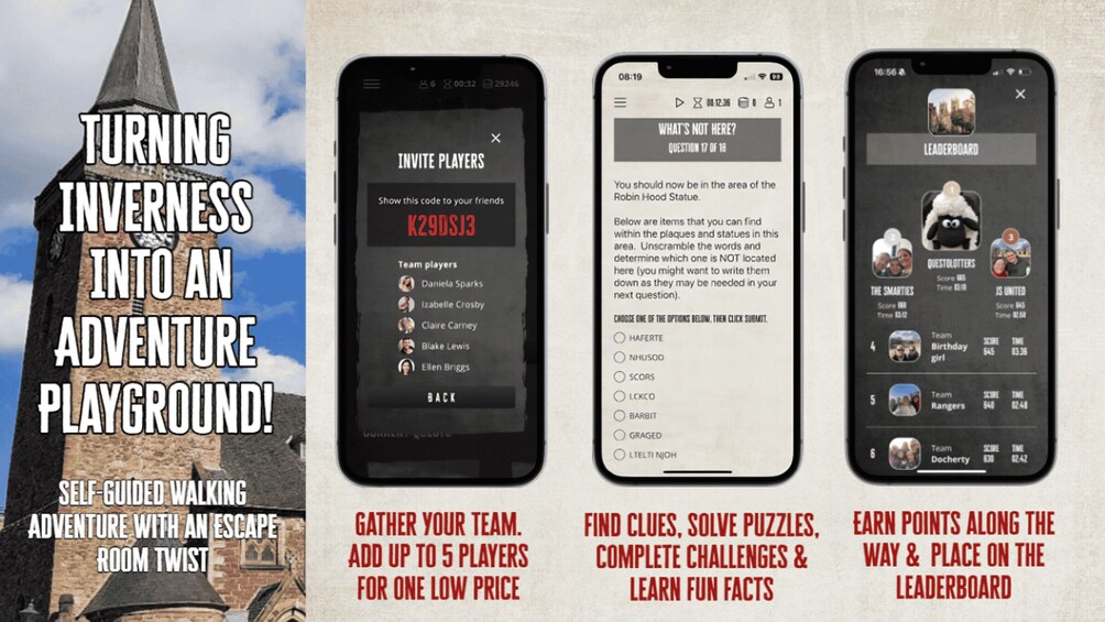 Explore the vibrant streets of Inverness as your team unlocks a hidden trail, finding clues, solving puzzles, and completing challenges, earning points along the way all self-guided through the Go Quest Adventures app. See the area's highlights, explore its hidden gems, and learn some insider history and fun facts along the way.