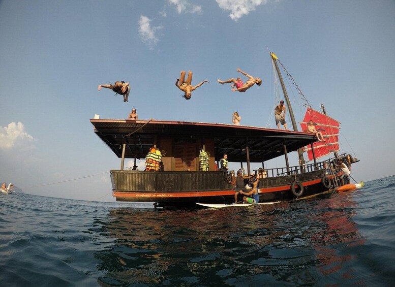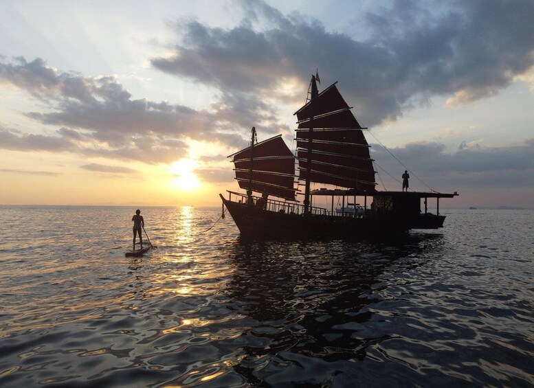 Embark on an exciting adventure with a private sunset trip, where luxury meets personalised exploration. Set sail from Ao Nang or Railay Beach on an exclusive 100-year-old junk boat, designed for comfort and style, and enjoy a range of activities tailored to your interests. Glide through crystal-clear waters while paddleboarding or kayaking, or simply relax on a secluded beach for a tranquil escape.