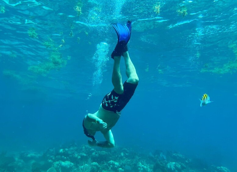Upon arrival at the port, our friendly team will welcome you and escort you to our comfortable motorised boat. We’ll head across the crystal-clear Caribbean Sea for two unforgettable snorkelling sessions. The first stop is “The Wall,” an impressive underwater cliff teeming with coral, colourful tropical fish, and sometimes rays or sea turtles. Next, we’ll visit “The Aquarium,” a calm, shallow, and vibrant site—perfect for beginners and experienced snorkellers alike.