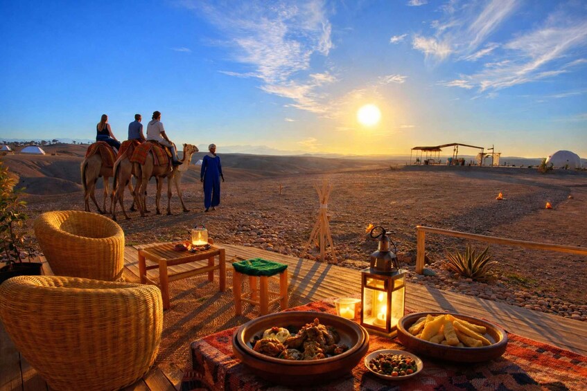 Upon arrival at the desert camp set within Agafay’s rugged landscapes, you’ll be warmly welcomed with refreshing Moroccan mint tea and traditional delicacies. As the sun slowly dips behind the rocky hills, panoramic views create a peaceful and romantic setting, ideal for unwinding and fully embracing the beauty of the desert.