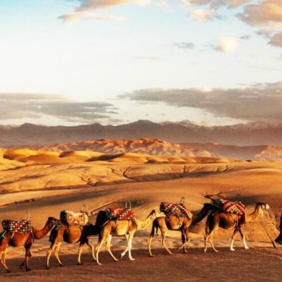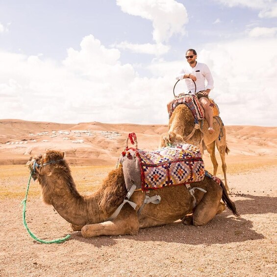 After hotel pickup in Marrakech, set off to the Agafay Desert. Upon arrival, enjoy a warm, traditional welcome with aromatic Moroccan tea, a symbol of hospitality, and settle into a cosy seating area. As the sun starts its descent, witness the vivid hues of the sunset painting the desert vistas.