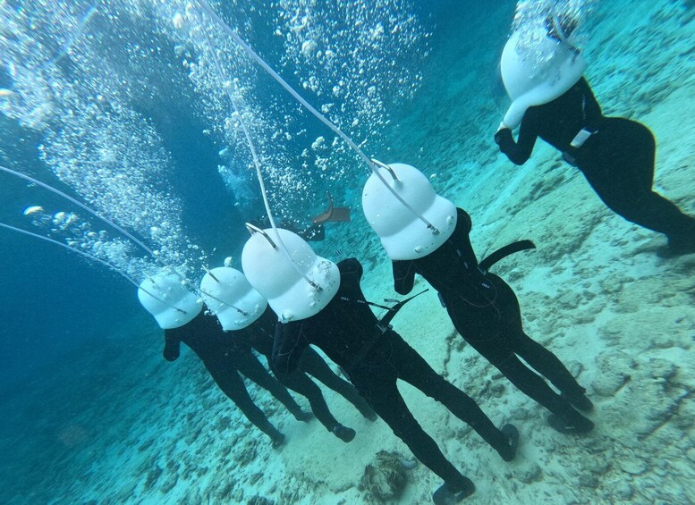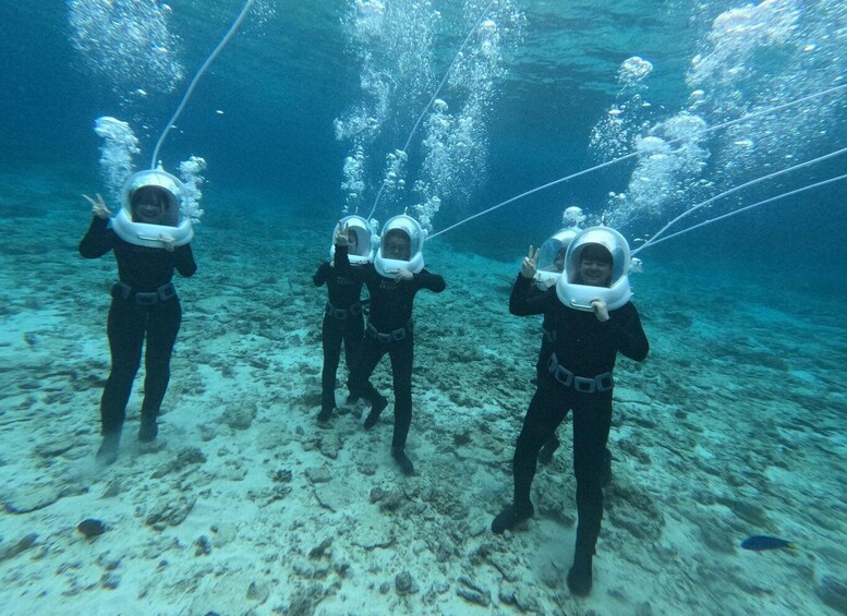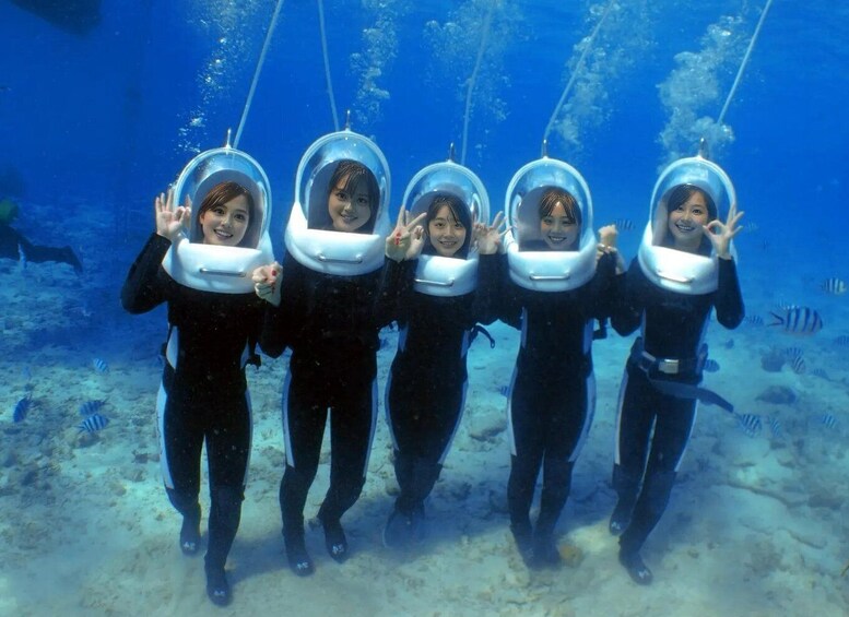 The Sea Walk experience takes place at a different underwater location within Onna Village, selected for its calm conditions and sandy seabed. At this Sea Walk point, guests descend a ladder from the boat with instructor assistance and walk slowly along the ocean floor. A specially designed helmet allows natural breathing through the nose and mouth while keeping the face and hair completely dry. No swimming experience is required.