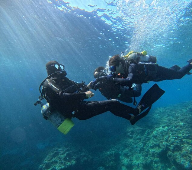 For Discovery Scuba Diving, the instructor will assist guests with putting on diving gear and provide guidance throughout the experience to ensure safety during the visit to the Blue Cave.