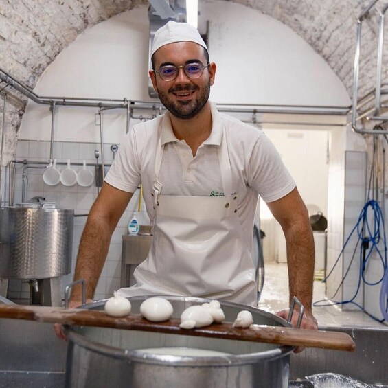 Our tour includes the chance to make a burrata or mozzarella with your own hands. Throughout the tour, you'll be guaranteed water service. At the end of the visit, you'll be served our tasting plate, which includes 5 types of cheeses, cold cuts, Apulian taralli, Apulian focaccia, and a final dessert, all accompanied by local wine.
