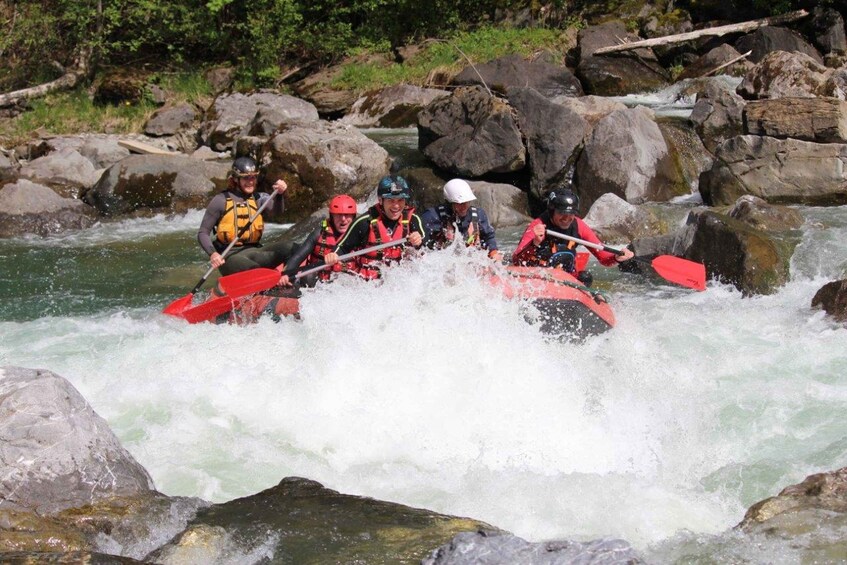 In the truest sense of the word, all participants are in the same boat when rafting in the Allgäu. Concentration and discipline are required of each and every one of you when you're going down the river and the water is splashing wildly around your ears. Well-trained and certified boat guides are on board, who teach the participants the most important basic rules for behaviour in whitewater in advance. These are quickly learned, so you'll feel absolutely safe while rafting in the Allgäu. Safety first, but fun comes right after! Rafting is a great experience for everyone, and also for families, friends, or colleagues. Cooperation and team spirit are encouraged, and in the end, all participants stand together as successful conquerors of the tides. Rafting in the Allgäu is ideal for any kind of excursion and event.