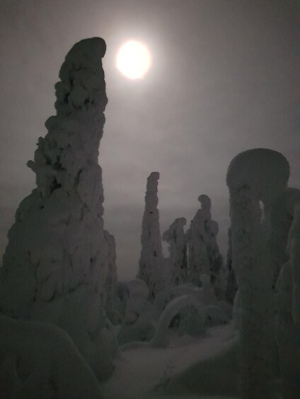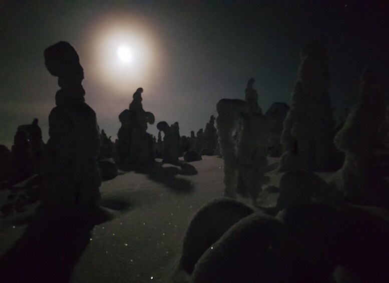 Wander around with snowshoes, follow trails, and find your way through deep snow. As we climb higher, the views open up. Riisitunturi’s famous “snow monsters”—trees heavy with thick layers of snow—stand like silent sculptures all around. Your local Finnish guide will share stories about the area’s nature, wildlife, and local life in the Arctic.