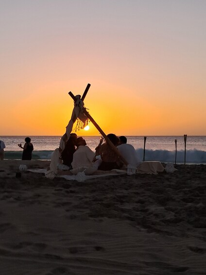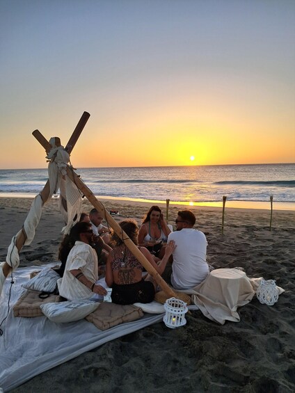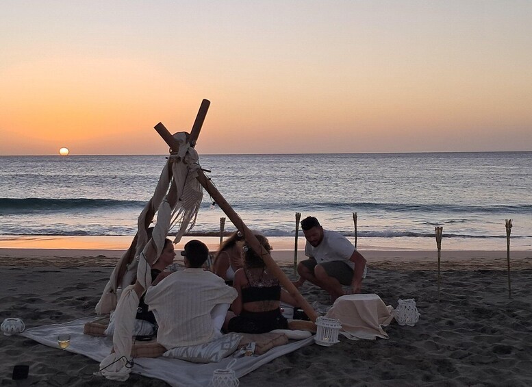 Upon arrival, find a dreamy boho-chic setup featuring soft pareos, plush cushions, glowing torches, and flickering candles. The stage is set for you to sit back, unwind, and soak in the golden hues of the sunset over the Atlantic.