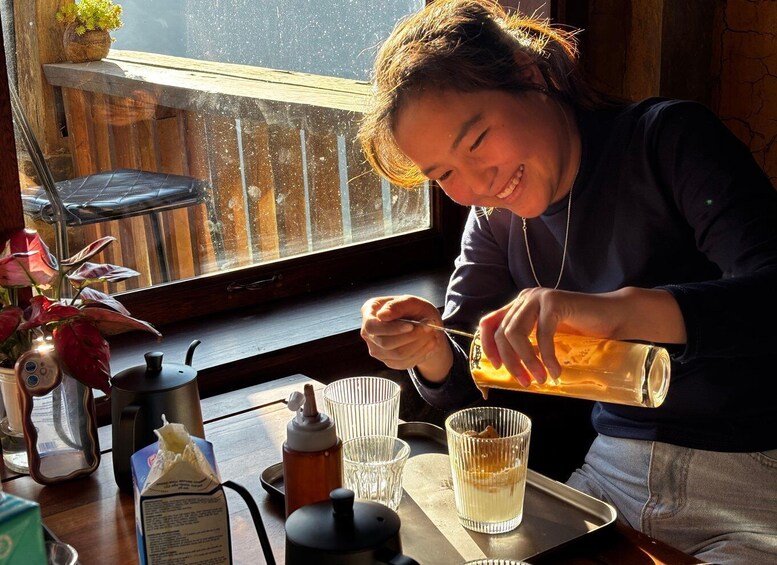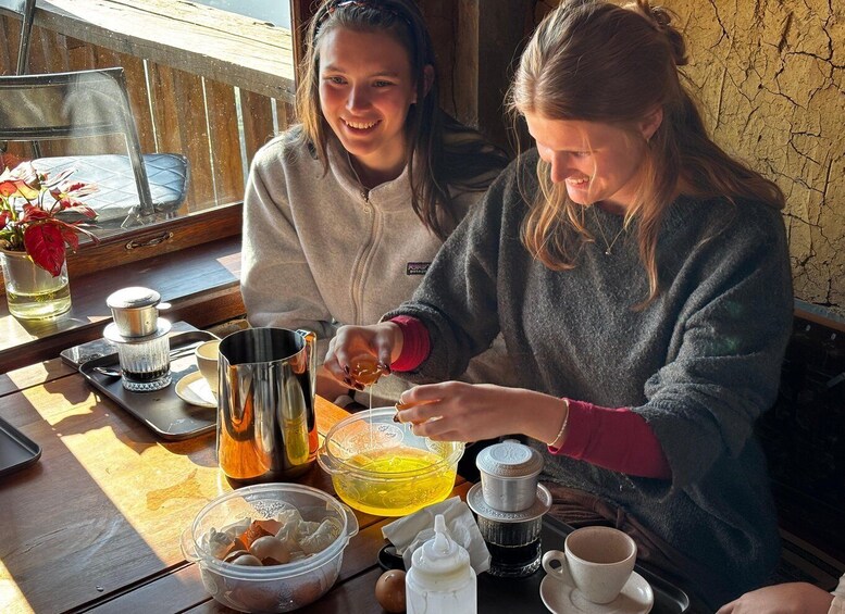 Finally, relax at a cosy café with stunning mountain views and join a condensed Vietnamese coffee workshop tailored for guests who have already enjoyed a full meal. In this mini workshop, you’ll learn and make three iconic drinks:
