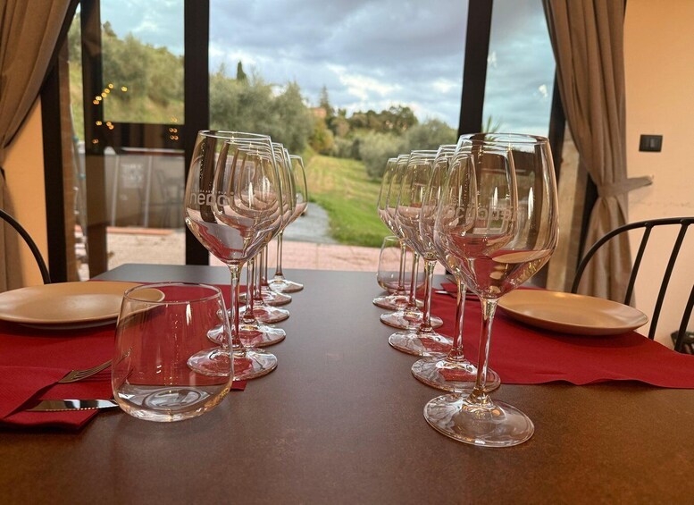 When you arrive, you'll be welcomed in a rustic square, which leads to the tasting room, overlooking the natural surroundings of olive trees, vineyards, and our cultivated fields.