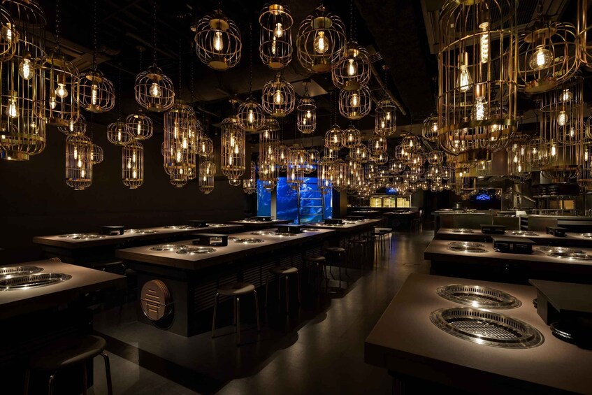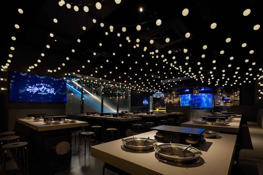 The interior is illuminated by the blue of the aquarium and warm-colored lights, creating a magical atmosphere. The restaurant offers a one-person hotpot experience, featuring fresh seafood and premium black wagyu, prepared to your liking — whether grilled or in a hotpot. Customise your hotpot dishes by selecting your preferred ingredients and broth, with options including wagyu yakiniku, grilled seafood, shabu-shabu, sukiyaki, and seafood hotpot.