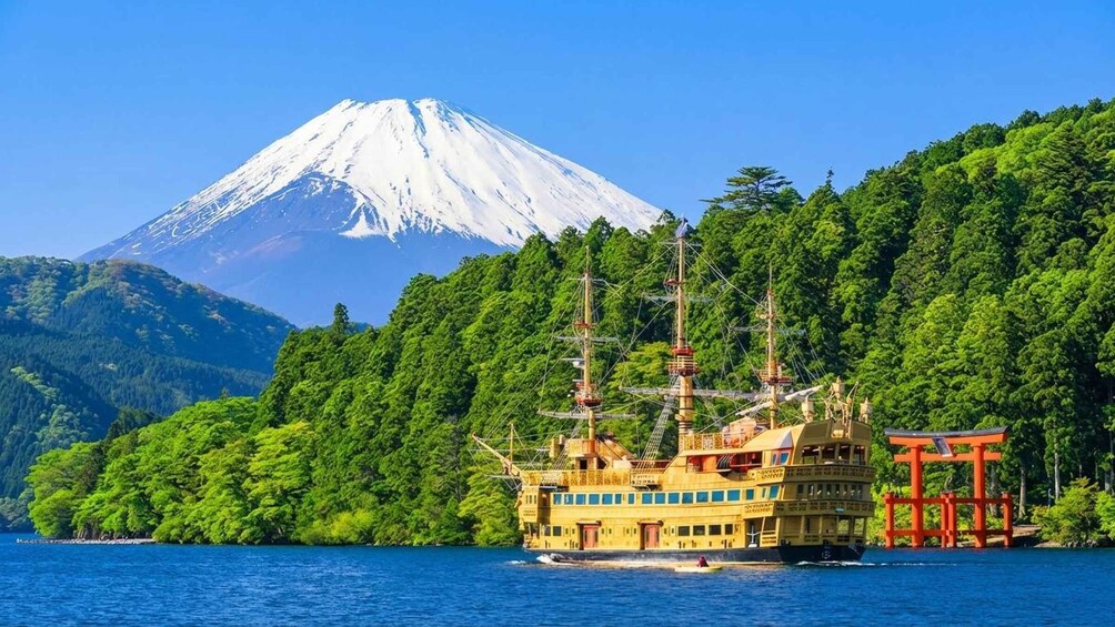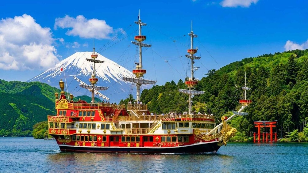 Board the Hakone Pirate Ship for a 30-minute ride from Moto-Hakone Port. Enjoy the sea breeze and views of Mount Fuji and lakeside mountains.