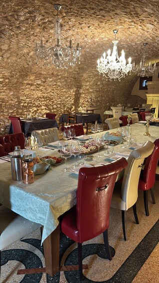 Tasting in the historic 17th-century barrel cellar, a unique setting that tells centuries of history.