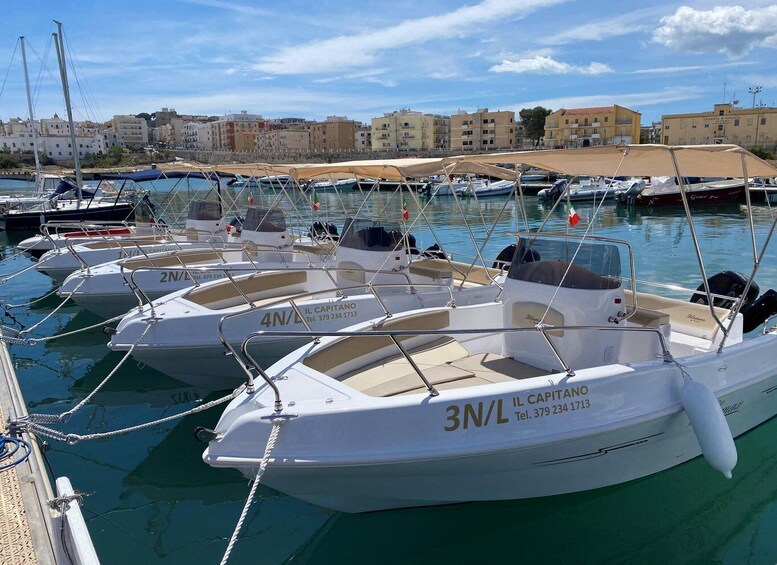 Explore the Gargano coast aboard boats with a modern design, comfortable and fully equipped (large sundeck, awning, stern sofa, ladder, cool bag on request).